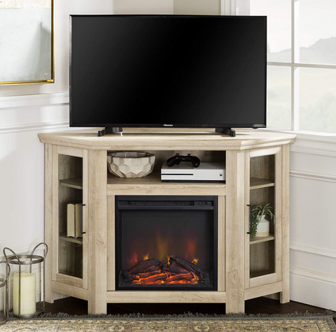 A corner console is an excellent solution for people who are limited on space or do not want the TV to be the focal point of the family room. This lovely fireplace TV stand accommodates screens up to 55 inches in size and has two adjustable shelves on each side hidden behind tempered-glass doors, ideal for displaying photographs, books, or ceramics. There's also a large open shelf for storing gaming gear or a speaker.
