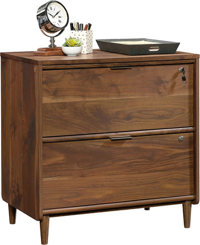 The Sauder Clifford Place Lateral File Cabinet in classic walnut will keep your office or workstation looking neat and stylish. The two spacious file drawers in this mid-century-inspired file cabinet open and close on smooth full extension slides. Each drawer can hold letters or legal size hanging files, allowing you to keep all of your important files and papers organized and accessible.