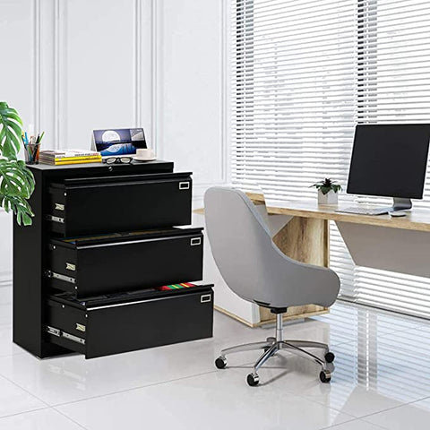 This three-drawer lateral file cabinet is roomier and has more depth than comparable options, so you can store up to 300 hanging folders in each drawer. Each drawer has two removable, adjustable hanging rails, so you may use it to hold letter-, legal-, A4-, or F4-sized folders. Each drawer in this black filing cabinet can store 110 pounds, for a total capacity of 330 pounds thanks to the unit's all-in-one design and the frame's use of high-strength cold-rolled steel. Durable, long-lasting, and resistant to corrosion, rust, and electrostatic discharge, the epoxy spray coating provides excellent protection against the elements.